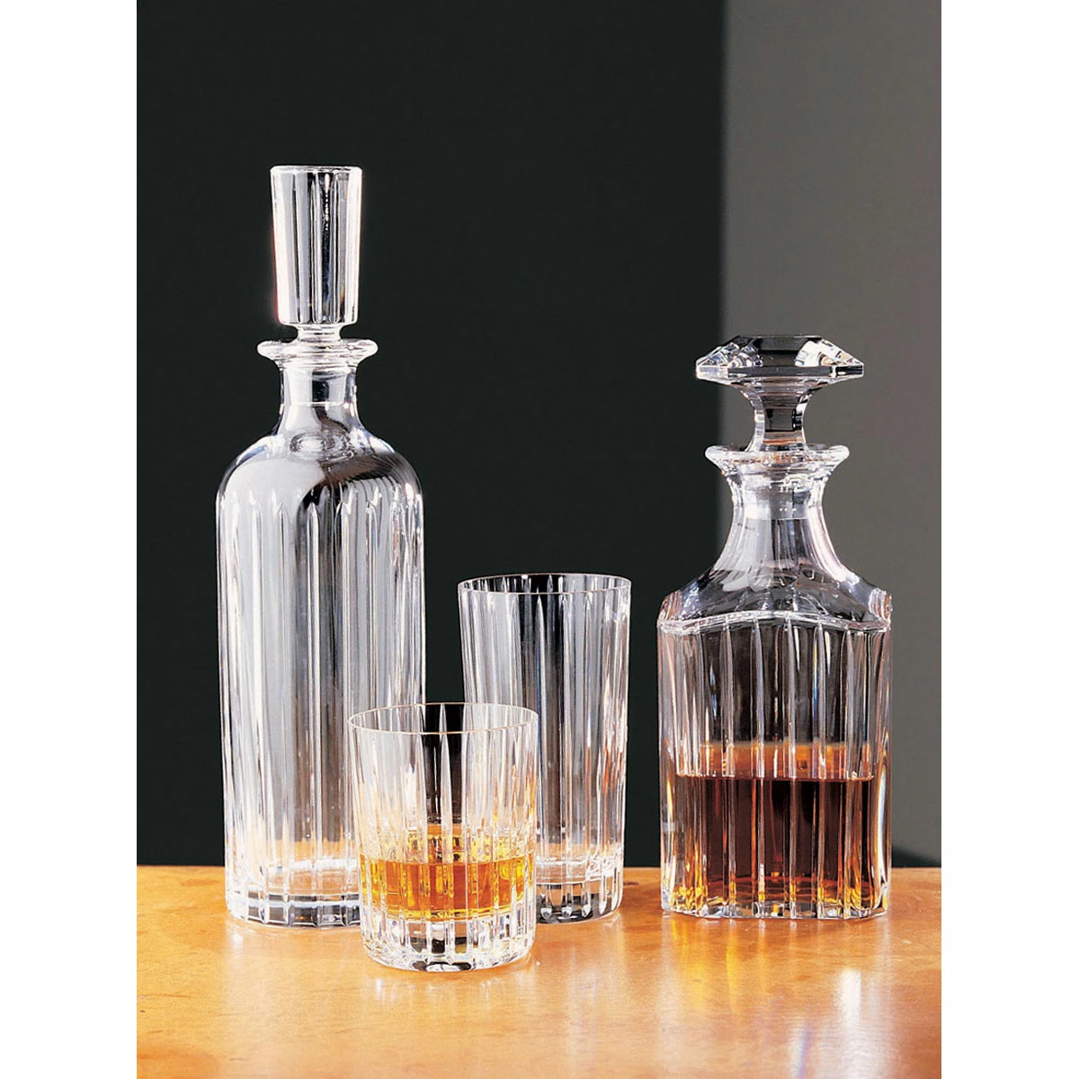 The lean stripes bring a textural quality to the surface, not only showcasing the three-dimensionality of the Crystal Decanter but also creating a visual depth to the whiskey within. The diamond-cut beveled stopper crowns the Crystal Decanter with geometric emphasis and sophistication.