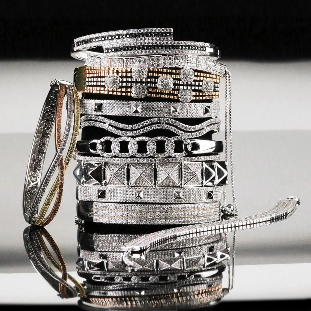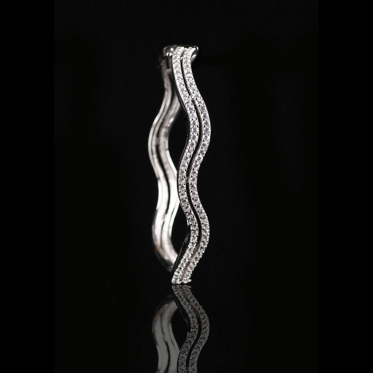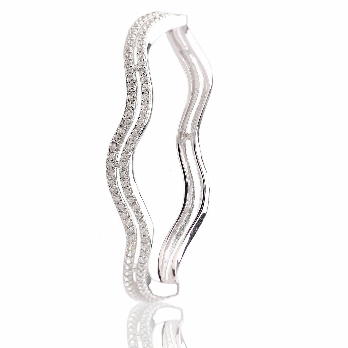 Delicate, romantic, and very feminine – this exquisite sterling silver bangle adds a touch of sparkling sophistication to any outfit. This elegant and stylish bangle features two waving rows of clear crystal pave in sterling silver. Wear this creation alone or stack it together with other bangles for a popular layered look.