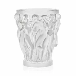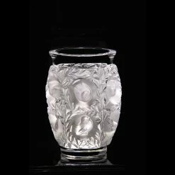 Lalique glass is lead based, either mold blown or pressed. Favored motifs during the Art Nouveau period were dancing nymphs, fish, dragonflies, and foliage. Characteristically the glass is crystal in combination with acid-etched relief. In addition to vases, clocks, automobile mascots, stemware, and bottles, many other useful objects were produced. While not well known, Lalique also experimented with bronze and other materials as well.