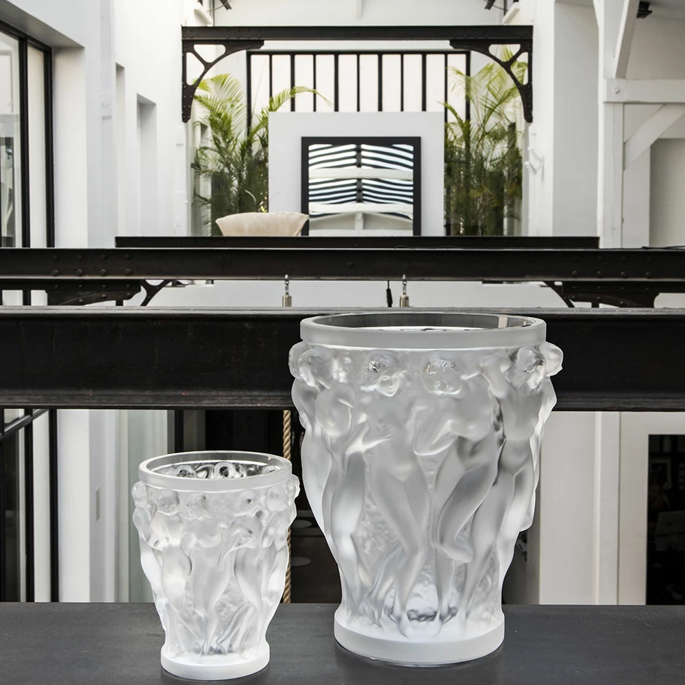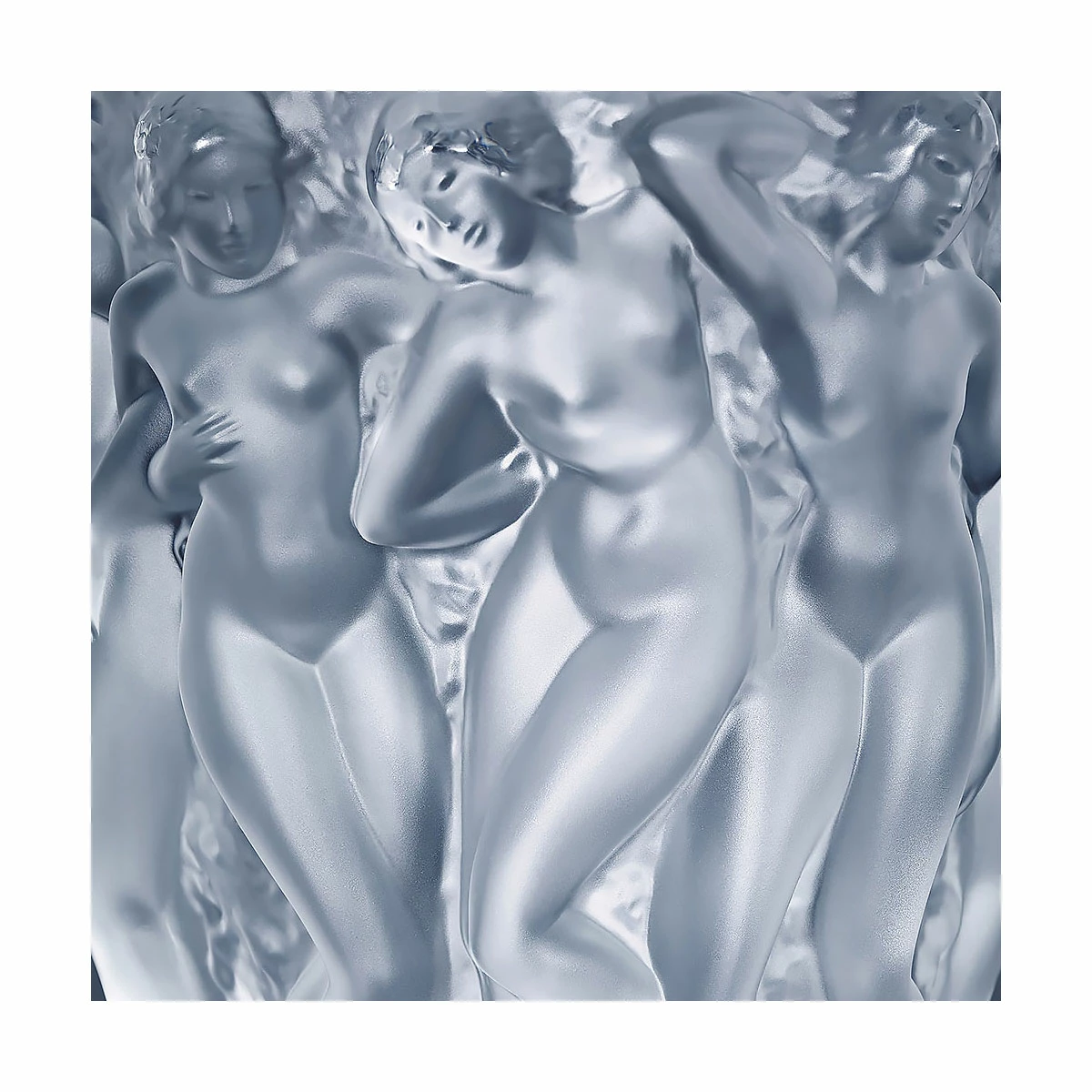 Lalique glass is lead based, either mold blown or pressed. Favored motifs during the Art Nouveau period were dancing nymphs, fish, dragonflies, and foliage. Characteristically the glass is crystal in combination with acid-etched relief. In addition to vases, clocks, automobile mascots, stemware, and bottles, many other useful objects were produced. While not well known, Lalique also experimented with bronze and other materials as well.
