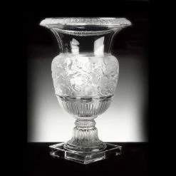 Lalique glass is lead based, either mold blown or pressed. Favored motifs during the Art Nouveau period were dancing nymphs, fish, dragonflies, and foliage. Characteristically the glass is crystal in combination with acid-etched relief. In addition to vases, clocks, automobile mascots, stemware, and bottles, many other useful objects were produced. While not well known, Lalique also experimented with bronze and other materials as well.
