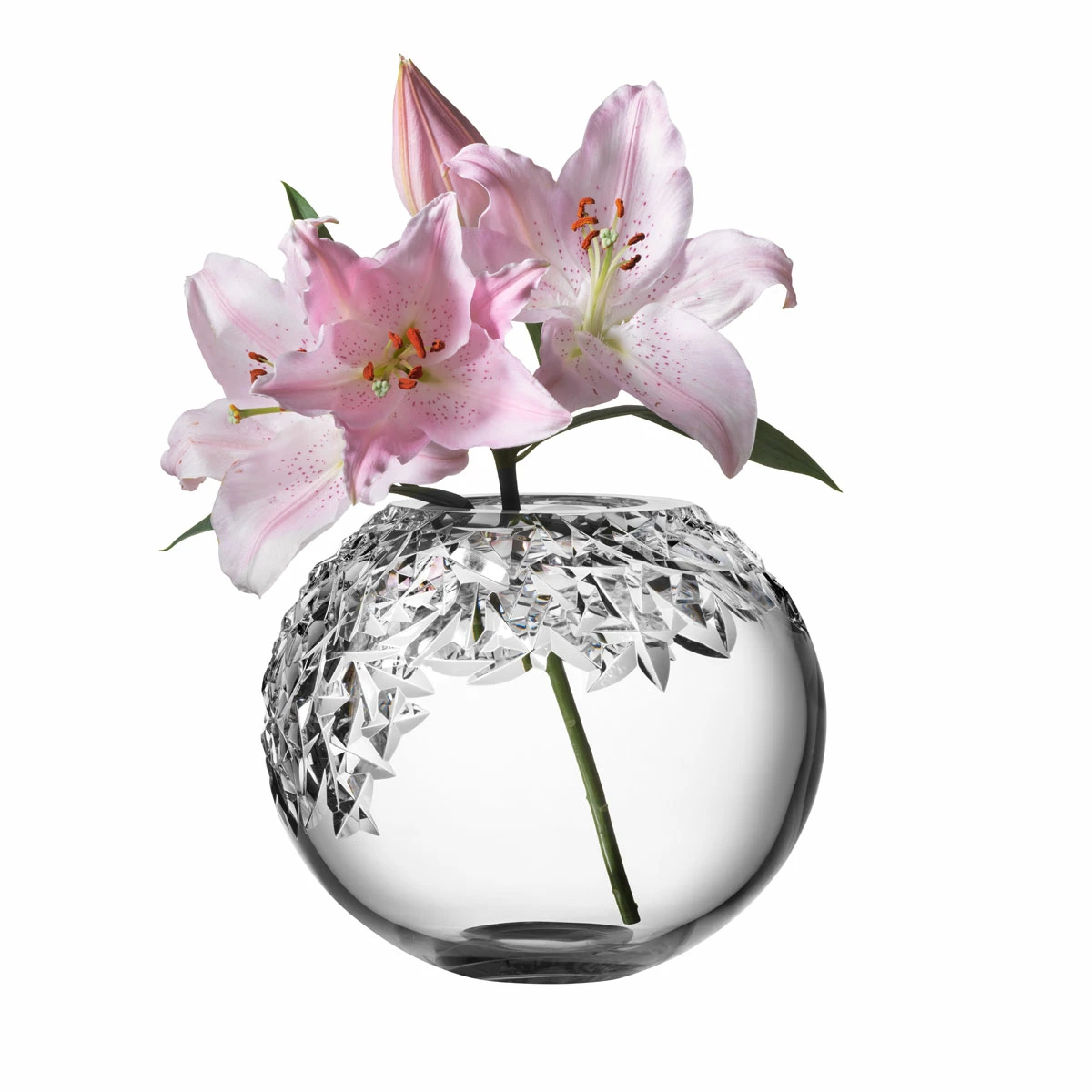 The Carat collection is based on a contemporary interpretation of the traditional cut glass for which Orrefors is world-renowned. Carat Globe Vase XL has an asymmetrical motif at the top, which produces beautiful reflections of light in the crystal and provides contrast against the smooth glass. The vase is perfect for top-heavy flowers and large bouquets since the globe shape allows the stems to spread out. Designed by Lena Bergstrom. H: 9.84″ W: 12.01″ TR 211 Crystal RSI Orrefors Kosta Boda 7321646062874 6590133 Vase 9.75″ Globe Cut Upper Carat Orrefors