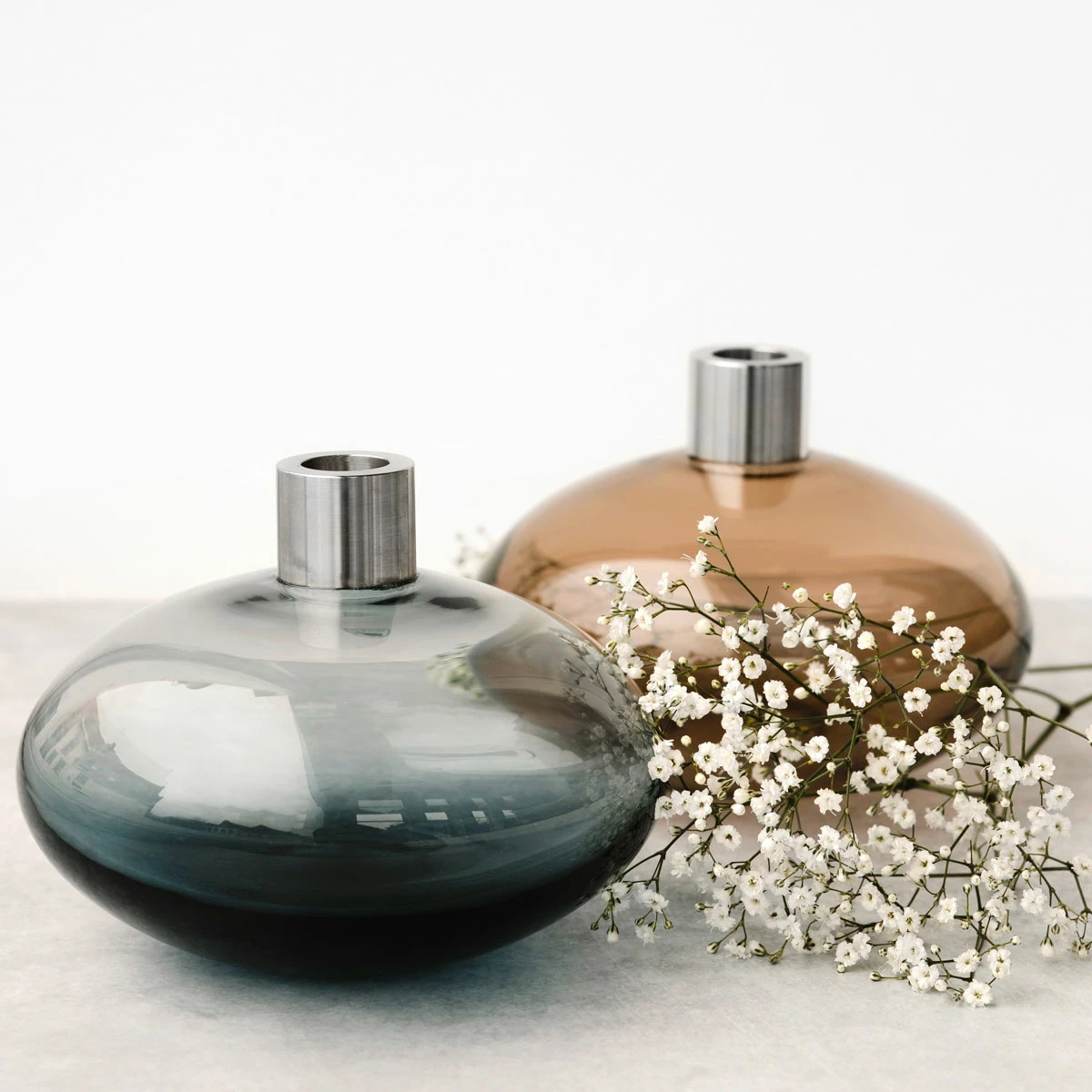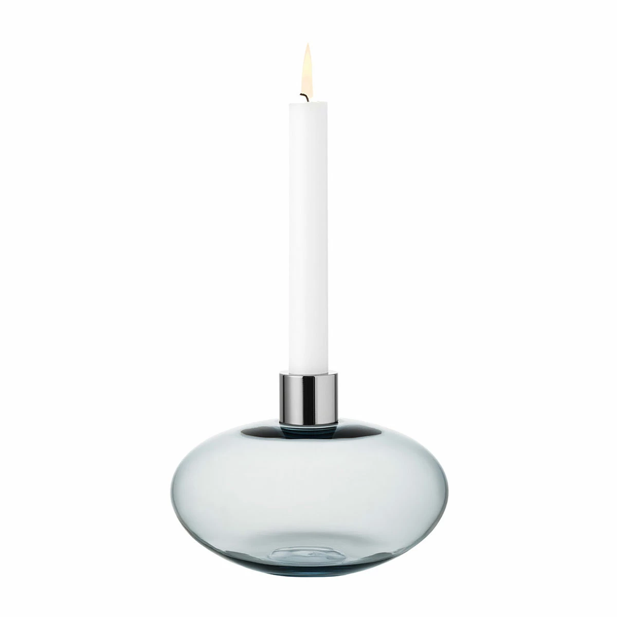 Pluto Candlestick from Orrefors in blue-gray has a minimalist, spherical shape influenced by Pluto the heavenly body categorized as a dwarf planet. The candlestick holder is mouth-blown and has details in stainless steel. Designed by Lena Bergstrom. H: 4.88″ W: 6.54″ SI 230 Crystal Orrefors Kosta Boda Orrefors Kosta Boda 7321646063314 6350162 Single Grey Candlestick 6.5″ Pluto Orrefors