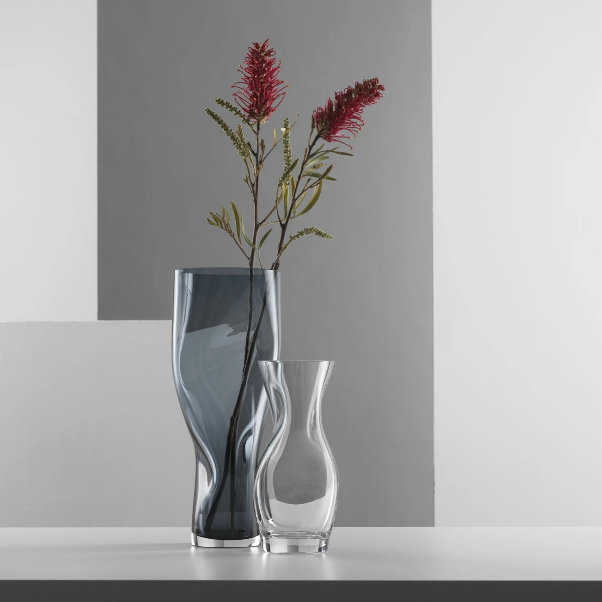 The billowy shape of Squeeze from Orrefors looks different from different angles, depending on its placement. After the vase is blown, and while still hot, it is squeezed together by hand in two places. These squeezes form a cross inside the vase, which holds the flowers in place, making the vase well-suited for a variety of bouquets. Designed by Lena Bergstrom. H: 13.39″ W: 5.71″ SE 211 Crystal Orrefors Kosta Boda Orrefors Kosta Boda 7321646065752 6562024 Tall Blue Vase 13.5″ Squeeze Orrefors