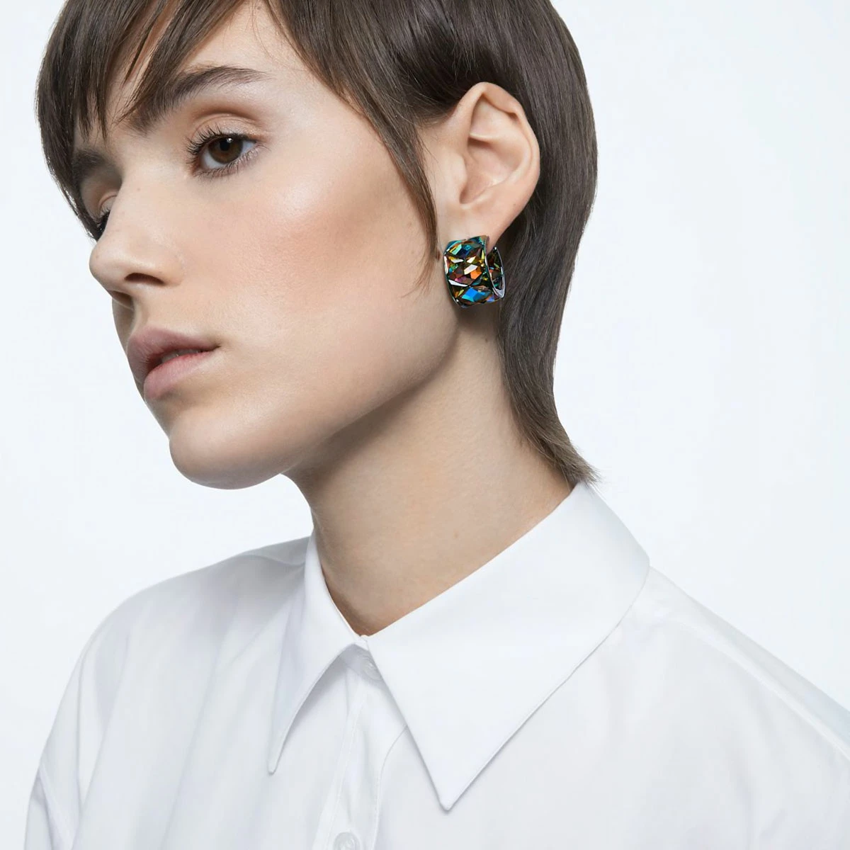 These statement hoop earrings feature rows of octagon cut crystals that face both outwards and inwards for a dazzling 360 degree effect. Elegantly finished with a tonal setting and sleek hinge fastening, embrace the magic of kaleidoscopic color and style yours with jewel tones and bold prints, day or night. These earrings are part of the Curiosa family, designed by Creative Director Giovanna Engelbert for Collection I. Length: 7/8″ x Width: 5/8″ IN 216 Jewelry SWAROVSKI FINANCIAL SERVICES Swarovski 191453141423 5599880 Pair Green Earrings Curiosa Swarovski