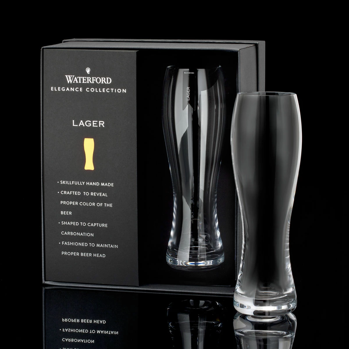Craft Crystal Beers of all kinds deserve the same attention and appreciation as fine Crystal Wine. Waterford Elegance respects and revers spirits of all colors and proofs with hand crafted lead free Crystal Lager Crystal Glasses. Waterford Elegance Lager Crystal Glasses are uniquely contemporary in design with a clear delicate Crystal Bowl and a crisp perfectly tapered rim aids in head retention and concentrates the aromas of your choice brew! Cheers!